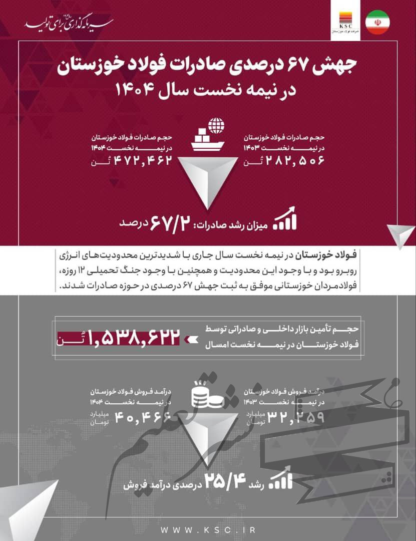 شرکت فولاد خوزستان در نیمه نخست سال ۱۴۰۴ با وجود تحمل شدیدترین محدودیتهای برق و همچنین جنگ تحمیلی ۱۲ روزه، عملکردی درخشان از خود به جای گذاشت و موفق شد جهشی کمنظیر در حوزه صادرات به ثبت برساند. حجم صادرات محصولات این شرکت در نیمه نخست سال جاری به ۴۷۲ هزار و ۴۶۲ تن رسید که در مقایسه با ۲۸۲ هزار و ۵۰۶ تن مدت مشابه سال گذشته، نشاندهنده جهشی ۶۷/۲ درصدی است.