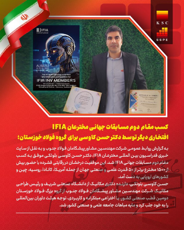 به گزارش پایگاه خبری نشر تعلیم از روابط عمومی شرکت مهندسین مشاور پیشگامان فولاد جنوب و به نقل از سایت خبری فدراسیون بین المللی مخترعان IFIA، دکتر حسن کاوسی بلوتکی موفق به کسب مقام دوم مسابقات جهانی IFIA شد.